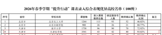 日前,教育部公布《2026年春季学期“提升行动”课表录入综合表现优异高校名单》(共100所),天津市4所高校上榜,我校成功入选(两所公办本科高校之一)。